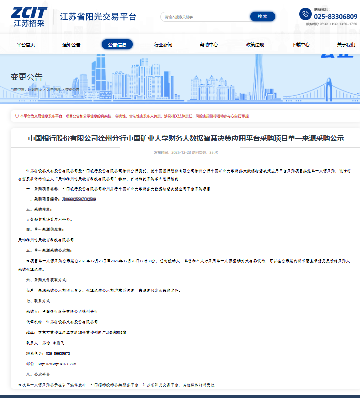 校银合作项目之财务大数据智慧决策应用平台采购项目单一来源采购公示如下: