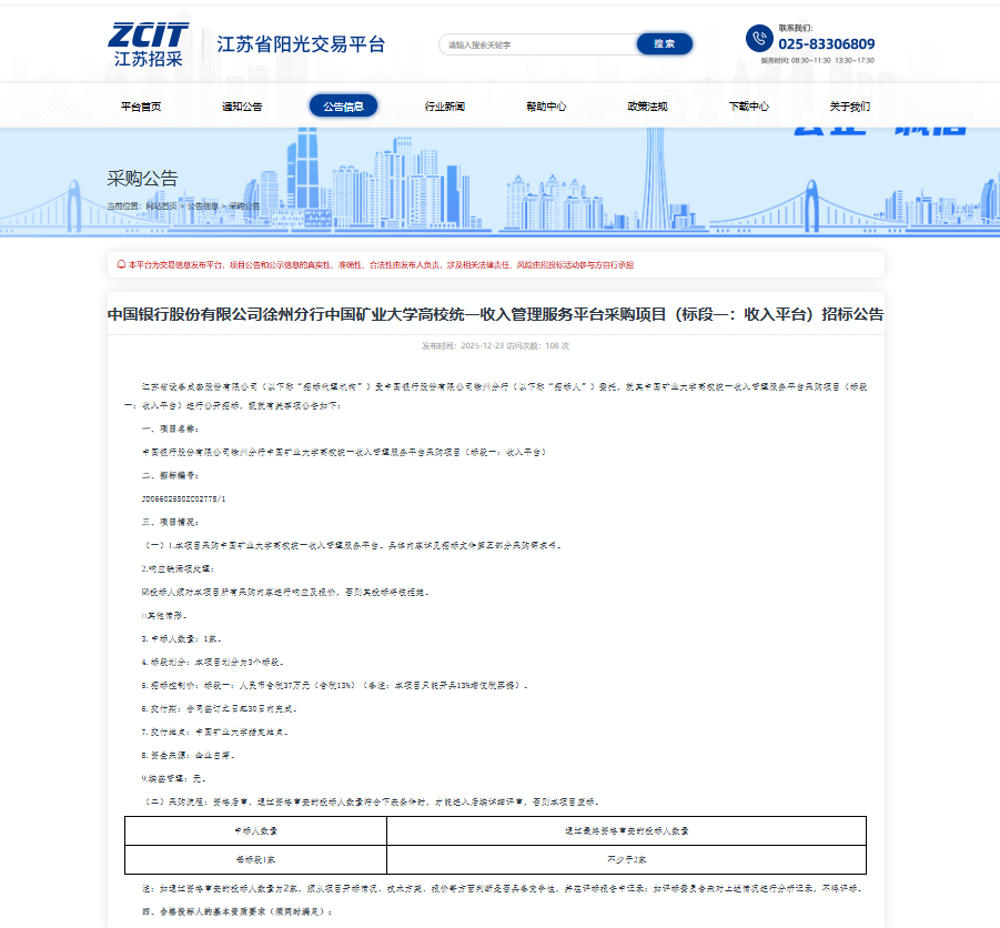 校银合作项目之高校统一收入管理服务平台采购项目(标段一:收入平台)招标公告如下:
