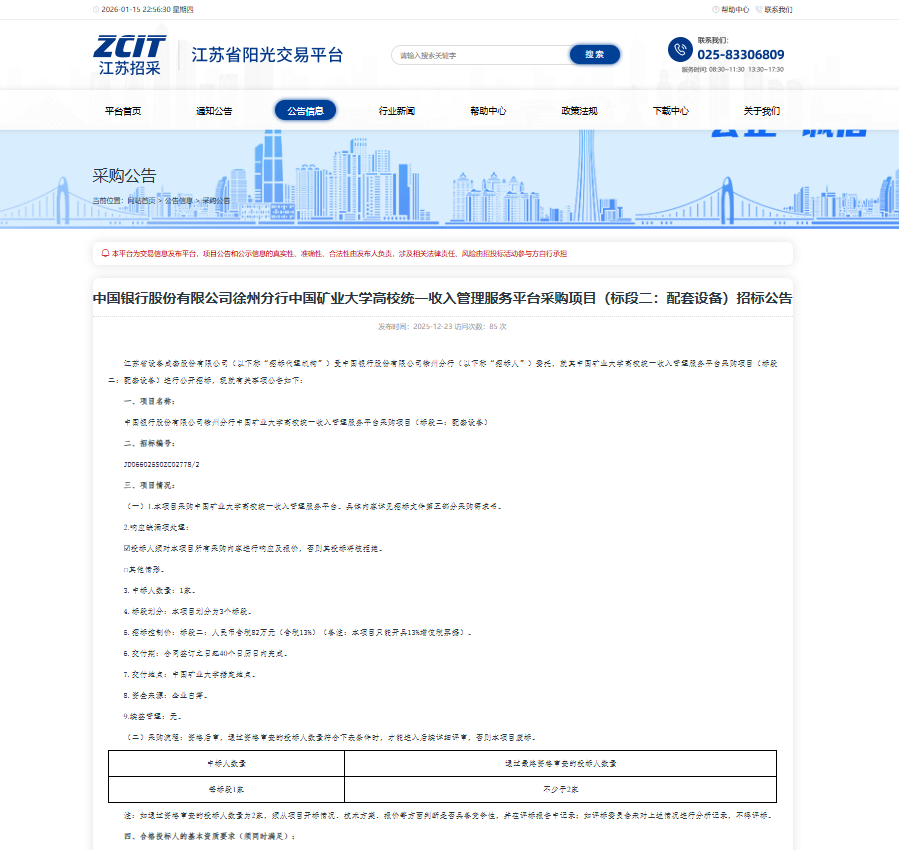 校银合作项目之高校统一收入管理服务平台采购项目(标段二:配套设备)招标公告如下: