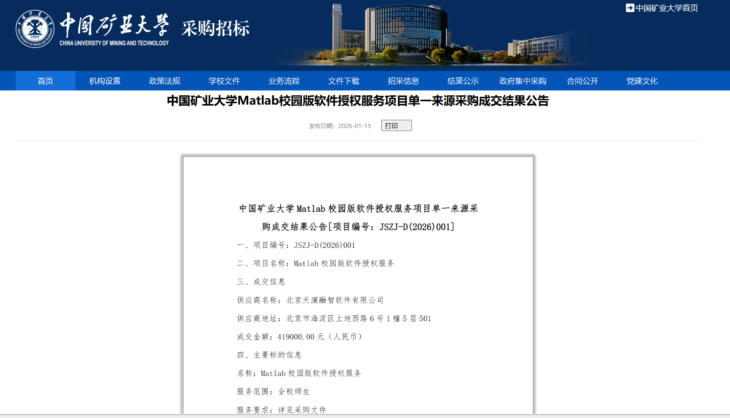 中国矿业大学校银合作项目之Matlab校园版软件授权服务项目单一来源采购成交结果公告