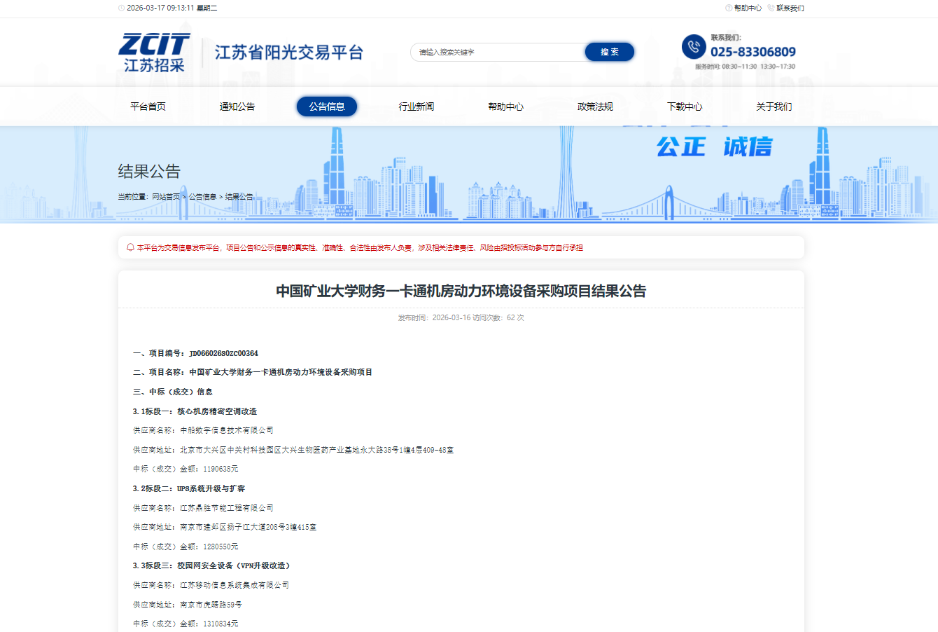 校银合作项目之财务一卡通机房动力环境设备采购项目结果公告如下: